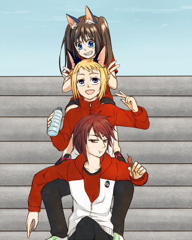 咏貼心的幫螢打開冰涼的寶特瓶水,湊近螢的嘴邊慢慢傾斜讓水流入口中,